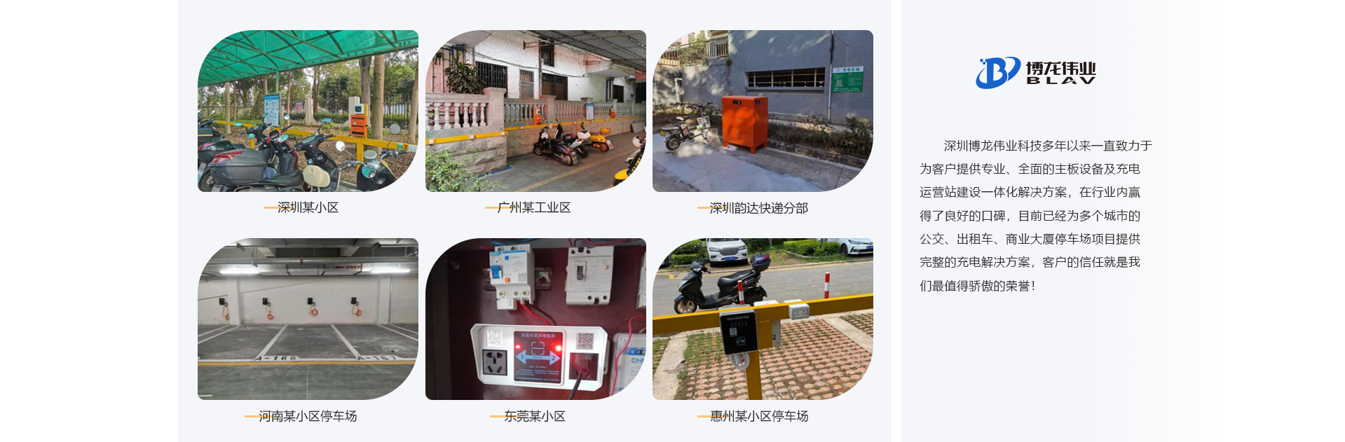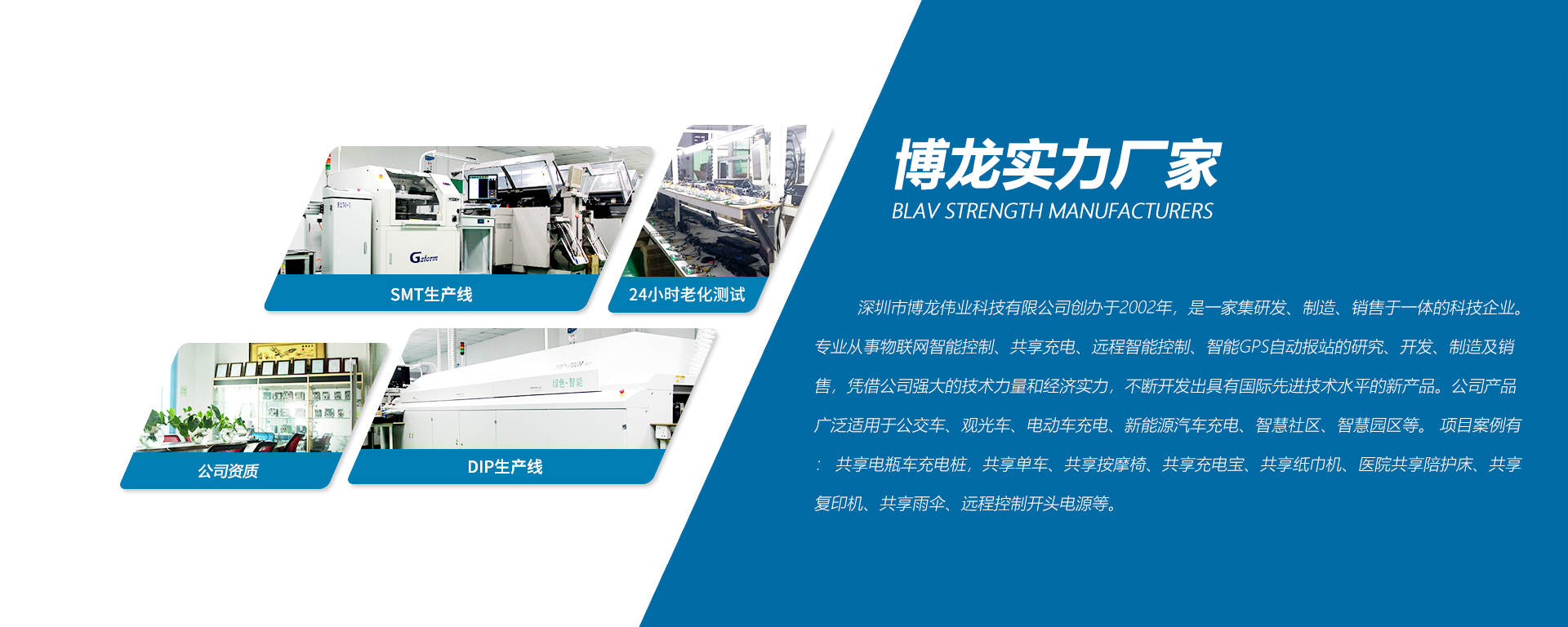 深圳市博龍偉業(yè)科技有限公司創(chuàng)辦于2002年,是一家集研發(fā)、制造、銷售于一體的科技企業(yè)。專業(yè)從事物聯(lián)網(wǎng)智能控制、共享充電、遠程智能控制、智能GPS自動報站的研究、開發(fā)、制造及銷售,憑借公司強大的技術(shù)力量和經(jīng)濟實力,不斷開發(fā)出具有國際先進技術(shù)水平的新產(chǎn)品。公司產(chǎn)品廣泛適用于公交車、觀光車、電動車充電、新能源汽車充電、智慧社區(qū)、智慧園區(qū)等。 項目案例有: 共享電瓶車充電樁,共享單車、共享按摩椅、共享充電寶、共享紙巾機、醫(yī)院共享陪護床、共享復(fù)印 機、共享雨傘、遠程控制開頭電源等。